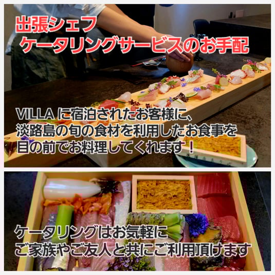 淡路島の旬の食材をその日に水揚げされた新鮮な状態で別荘にお持ちし目の前で調理してくれます。